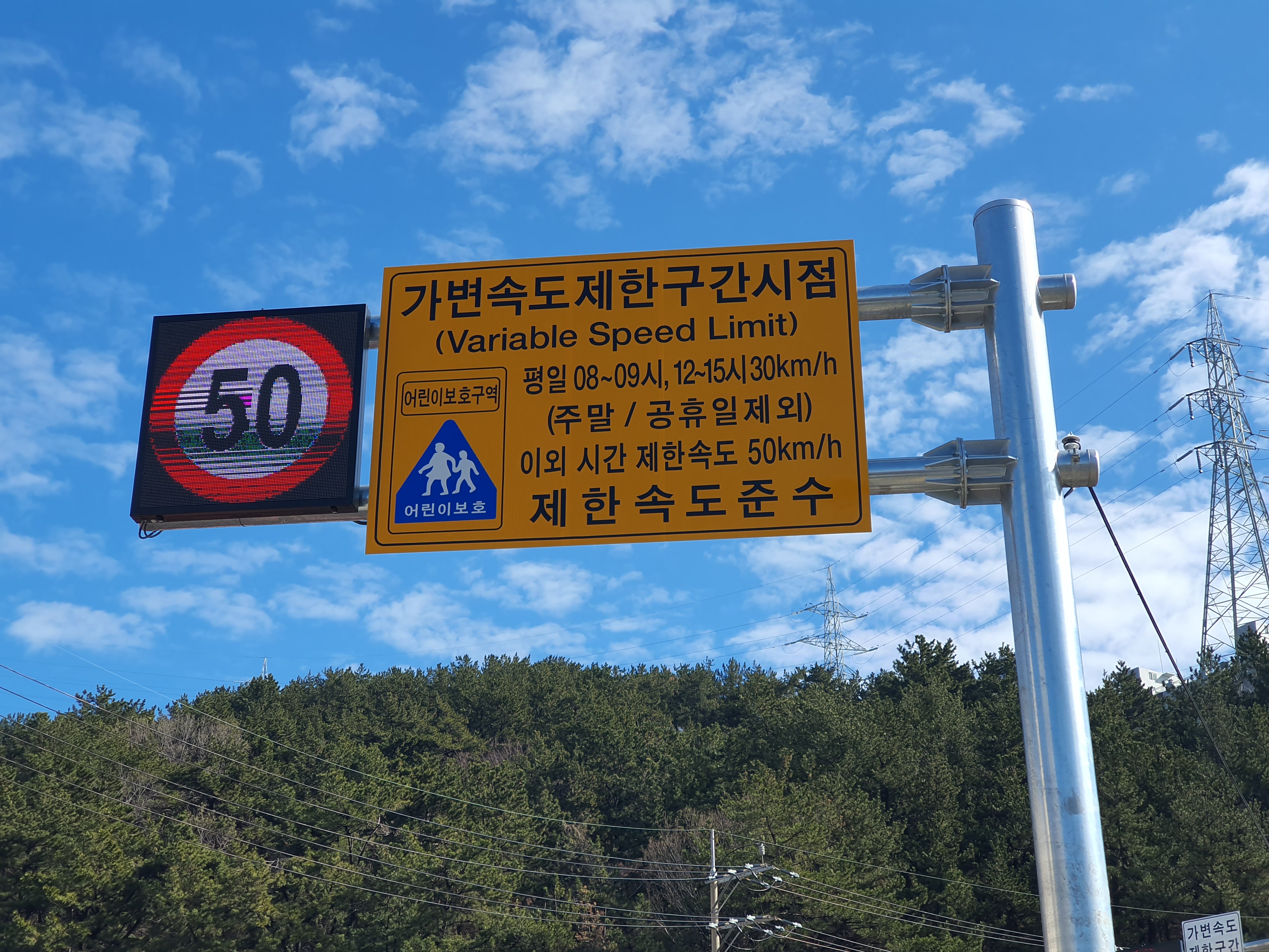 간단히 말해, 어린이보호구역 내 자동차의 제한속도를 시간대에 따라 조절하는 시스템입니다.